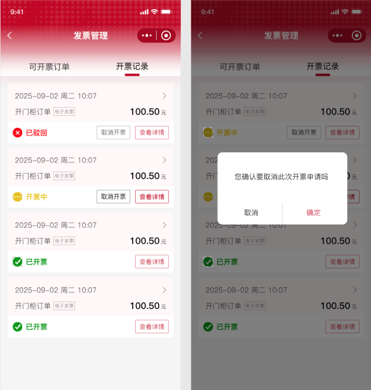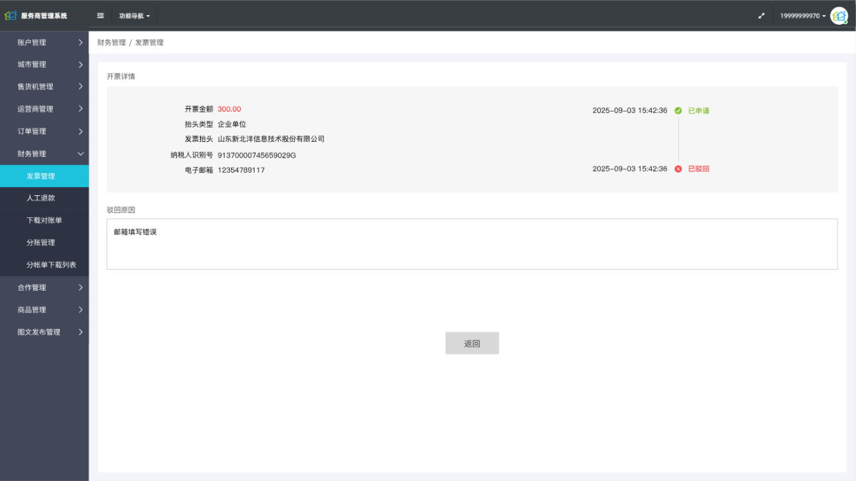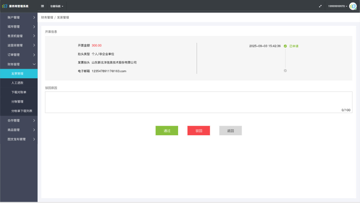 ## 使用场景: 随着业务规模与C端用户群体持续扩大,消费者在自助售货机消费后的发票需求日益旺盛。但目前小程序尚未开通线上开票渠道,用户无法自助完成开票,需通过人工客服申请。这一方式不仅耗时耗力,还导致用户等待时间过长,严重影响了用户体验与满意度,从而需要打造一个用户可自助、高效的线上发票申请与管理体系,同步提升用户体验与企业发票管理效率 ## 手册操作指南 ### 一,小程序操作流程 1,进入小程序我的页面,点击发票管理,选择需要开票的订单  2,根据个人需要,填写开票信息,填写完成后点击提交  3,开票完成后可在开票记录中查看已开票的信息,或者申请取消开票申请  4,在开票记录页面可根据需要查看,已开票,开票中和已驳回状态的发票详情,已驳回状态订单可申请重开发票  ### 二,服务商平台审核操作流程 1,登录服务商平台,在财务管理导航-发票管理菜单页面可以查看所有已经申请的开票记录,可对所有开票记录进行审核处理,管理人员可根据抬头类型和时间查询发票,发票列表信息根据状态分为“待处理”“已处理”“已驳回”,管理人员可根据状态类型查看对应的发票信息  2,在发票列表中-找到【待处理】的发票,点击操作栏【处理按钮】可进入发票详情页面对该发票进行通过和驳回处理,驳回时需填写驳回原因,驳回原因会在小程序反显给用户  3,在发票列表中-找到【已驳回】的发票,点击操作栏【详情按钮】可进入发票详情页面查看驳回原因,点击返回按钮可返回发票列表  3,在发票列表中-找到【已通过】的发票,点击操作栏【详情按钮】可进入发票详情页面查看详情信息,点击返回按钮可返回发票列表