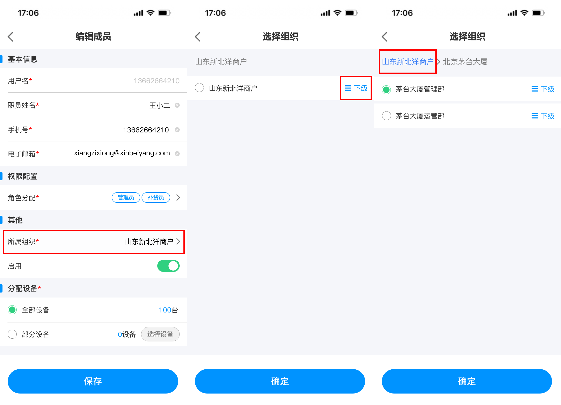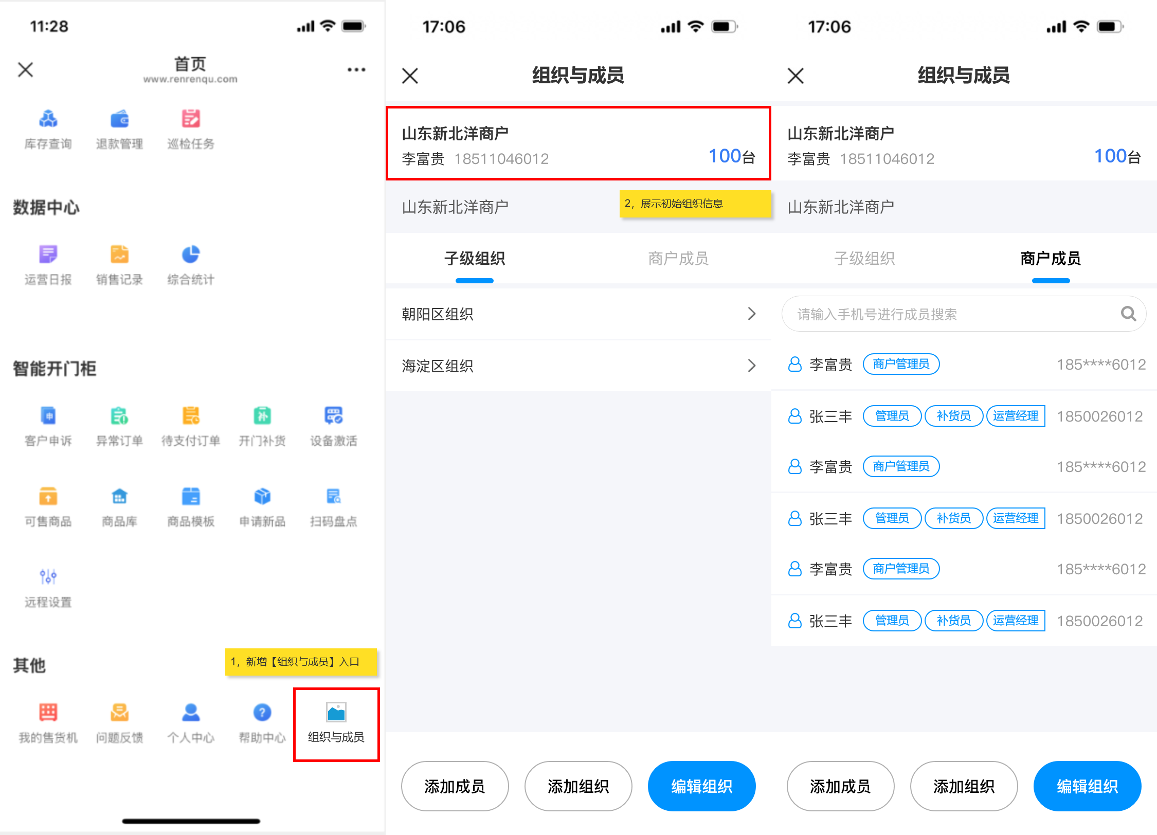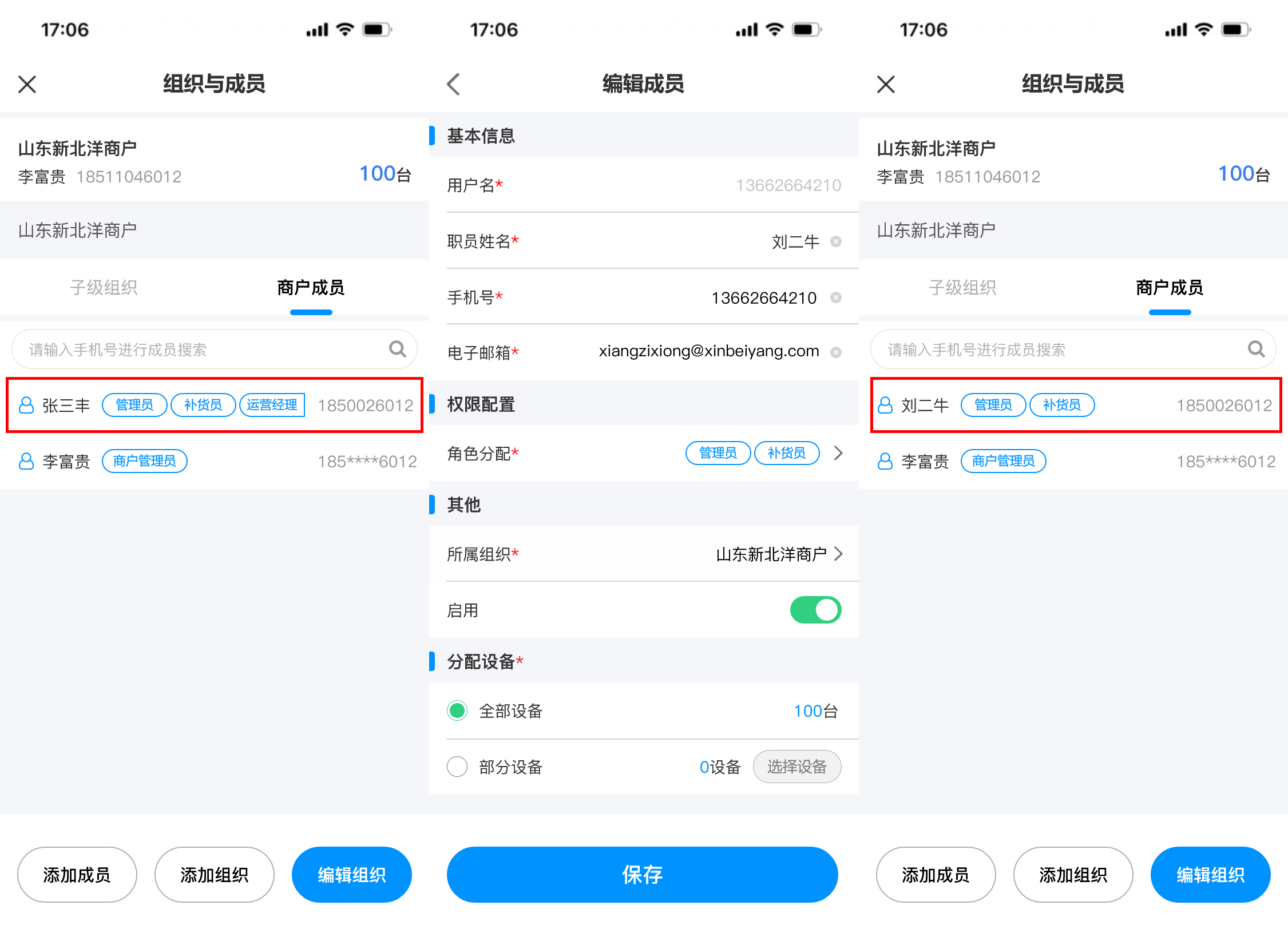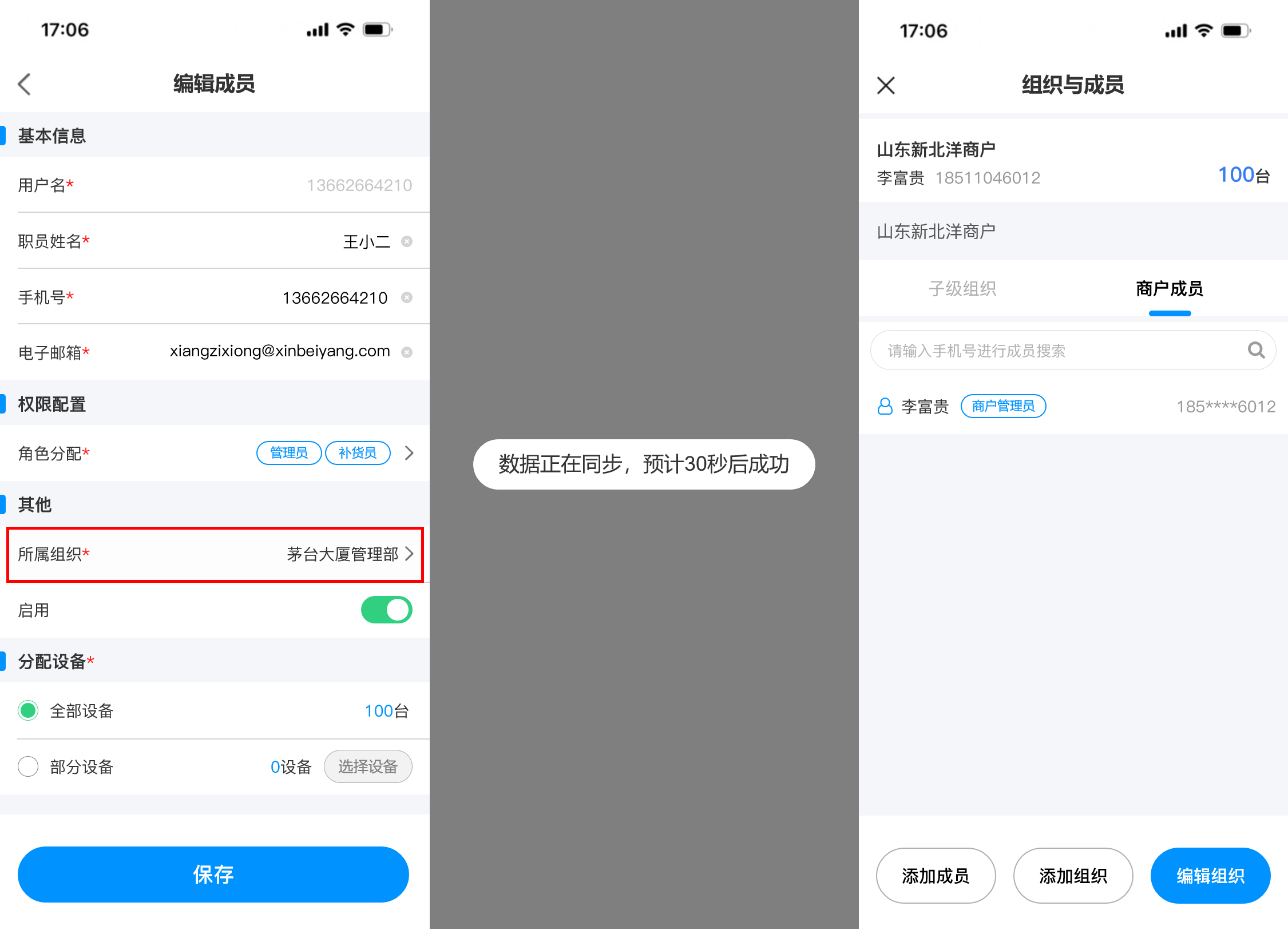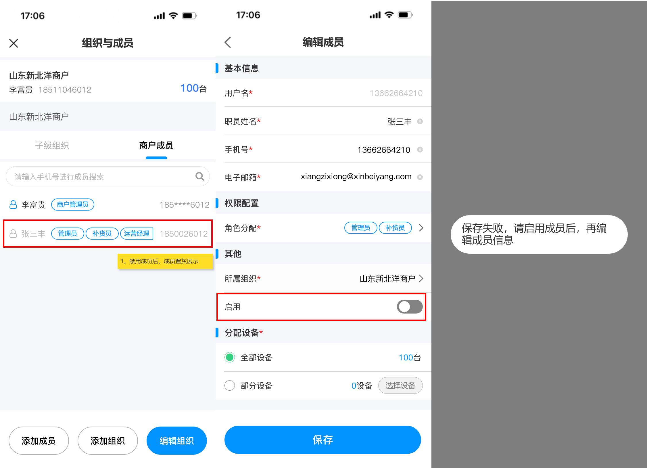 ## 使用场景 当前运营商组织与成员的管理功能仅支持在PC端操作,管理员可在PC端创建多级组织和成员并分配管理权限。然而,随着业务场景的多样化与现场运维需求的增加,现有PC端操作模式暴露出明显的局限性,加盟商,运维人员等角色在现场作业时,常遇到需即时创建组织或添加成员的情况,但受限于PC端固定办公场景,无法及时响应现场变化,影响运维效率与业务灵活性 ## 手册操作指南: ### 一,创建新增组织 1,在移动端首页新增【组织与成员】入口,点击进入后,展示商户初始组织信息和初始组织下的子级组织和成员,点击设备数量可查看初始组织下的所有设备  2,点击【添加组织】按钮,进入新增组织页面,填写所有信息后,点击【提交】,即可“新增组织成功”。组织添加成功后,新创建的组织会在子级组织列表下置顶展示  ### 二,编辑/删除组织 3,点击【编辑组织】可进入编辑组织页面,对当前组织信息进行修改,更换负责人时,可从成员列表中进行选择,信息修改完成后,点击页面底部【保存】按钮即可修改成功 4,如需删除组织,进入编辑组织页面后,点击底部的【删除】按钮,则可删除当前组织,删除组织时,需二次确认,当被删除组织下存在,设备,人员,子级组织时不能被删除,需解除清空组织的下的所有人员,设备,子级组织后方可直接删除成功(初始组织不能被删除)  ### 三,添加新增成员 5,新建组织成功后,在当前子级组织列表展示新创建的组织,点击新建组织名称后,可进入下级组织详情页面,顶部展示新建的组织信息,组织树展示当前组织和上级组织名称,点击上级组织名称可返回上级组织,新建组织下的子级组织和成员列表均为空展示,点击 “商户成员” tab切换至成员列表点击列表或底部的【添加成员】按钮,可跳转至添加成员页面,点击 “添加组织” 按钮可为当前组织继续添加子级组织  6,进入添加成员页面后,需要填写用户名,姓名,手机号和邮箱(用户名 用于运营商平台登录账号),点击【角色分配】可为创建的成员分配角色权限,在那个组织下添加成员,所属组织展示该组织名称,也可选择其他组织。密码发送默认短信发送,也可选择邮箱发送,分配设备时分为两个场景: (1)场景一:当组织设备为0,在创建人员时,只能选择 “全部设备” 即代表负责该组织下的全部设备,如后续为组织分配设备后,该成员即可负责该组织下的全部设备 当所有信息填写完成后,点击【保存】按钮,弹出 “新增成员成功” 提示,并告知密码已按选择方式,短信/邮箱发送。  (2)场景二:当组织设备不为0,在组织下添加成员分配设备时,可选择 “全部设备” 和 “部分设备” 两种选择方式,选择 “部分设备” 后,可点击【选择设备】按钮,在当前组织的设备池中选择需要负责的部分设备数量,选择完成后,点击【保存】按钮即可回到创建成员页面,此时部分设备数量反显已选择的设备数量。如要取消或增加设备数量,即可再次点击 “选择设备” 按钮在设备池中进行选择增加或取消  ### 四,编辑修改成员信息 7,当成员创建成功后,新创建的成员展示在 “商户成员” 列表中并且置顶展示,点击【成员名称或箭头】可进入成员详情页面,可对已经创建人员的基本信息,权限,组织,以及启用/禁用,进行编辑修改,用户名不可进行修改,如需修改人员负责的设备,也需遵从组织 “设备为0” 和 “设备不为0” 的两种场景,为0时,只能选择全部设备,不为0时,可选择全部设备和部分设备,当信息修改完成后,点击保存,即可更新信息成功,成员列表反显展示新修改的信息  ### 五,成员启用/禁用 8,如需禁用成员,则可在成员详情页面,点击启用【开关】对成员进行 “禁用” 操作,启用和禁用时均需二次确认,点击确认后,成员启用状态变更为禁用状态,成员被禁用后,所有权限均不可使用,也不能登录系统(启用/禁用操作实时生效)  9,当成员被禁用后,返回组织与成员页面,被禁用的成员置灰展示,代表该成员已被禁用,如点击被禁用的成员进入详情页面,是不能编辑修改成员信息的,如修改了信息点击【保存】时,会提示:保存失败,请启用成员后,再编辑成员信息  ### 六,成员变更组织 10,如需给已经创建的成员变更组织,则可在成员详情页面,找到 “所属组织” 点击进入更换组织页面,默认展示当前账号权限的最高组织(举例:当前账号为二级组织管理人员,那此时默认展示二级组织)可从高依次向下选择,点击【下级】按钮后,可进入下级组织进行选择,点击组织树的【上级组织名称】即可返回上级组织。找到需要调整的组织名称后,“选中组织” 点击底部【确定】按钮,即可更换成功  11,当组织更换成功后,所属组织显示新选择的组织名称,此时会toast提示:数据正在同步,预计30秒后成功,当数据同步成功后,该成员从原组织的商户成员列表中移除,并出现在新变更组织的商户成员列表中。(当组织变更后,该成员在之前组织下负责的设备会被清除,需在新组织下重新分配)