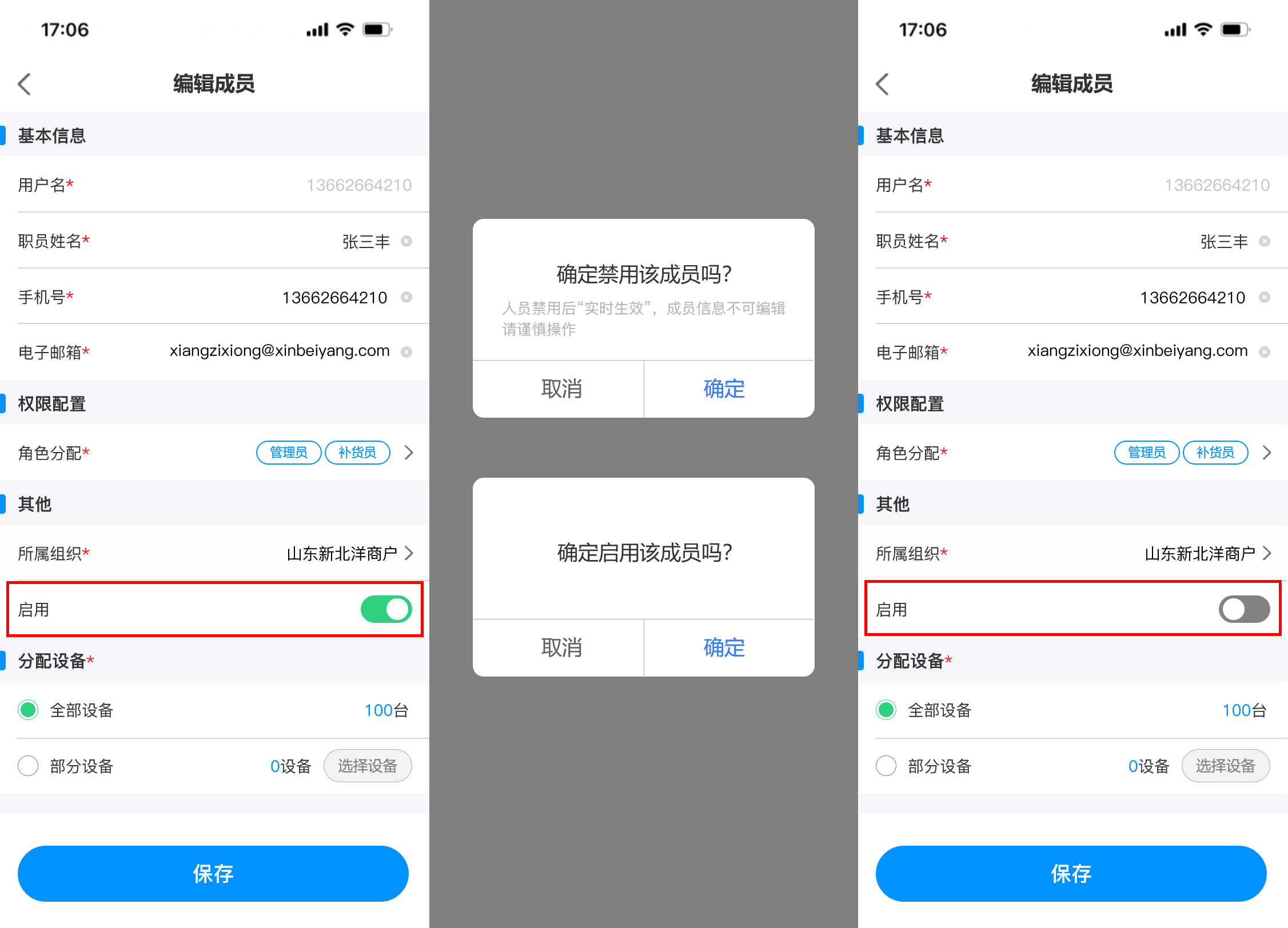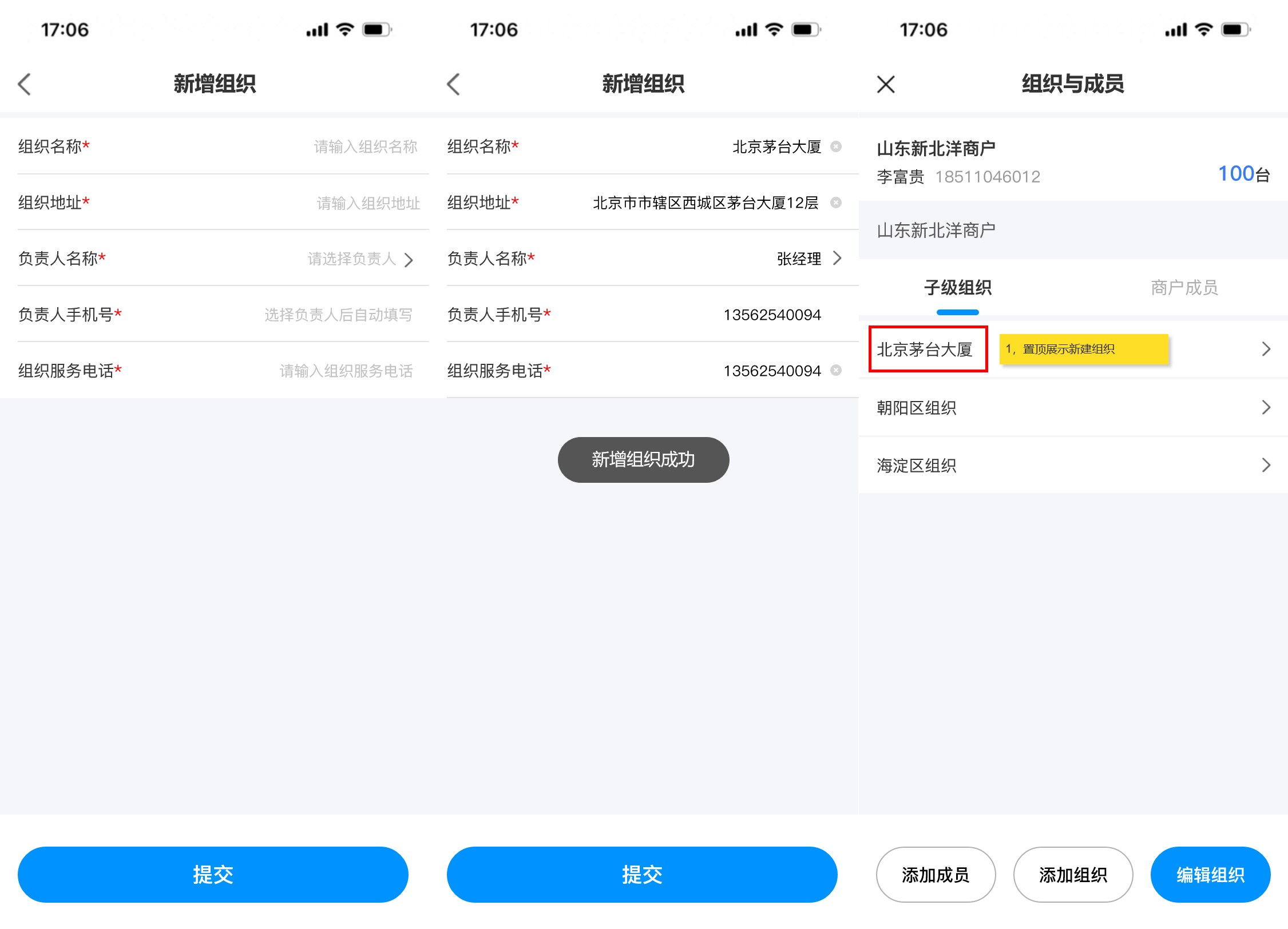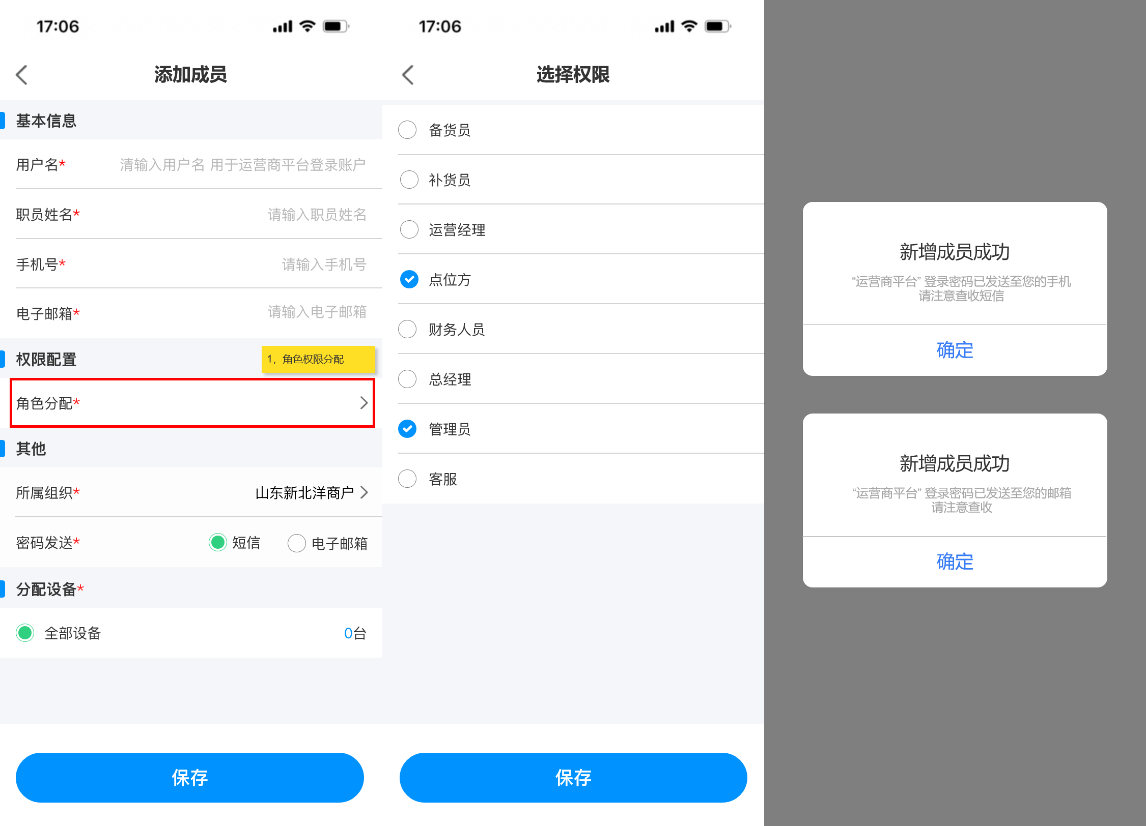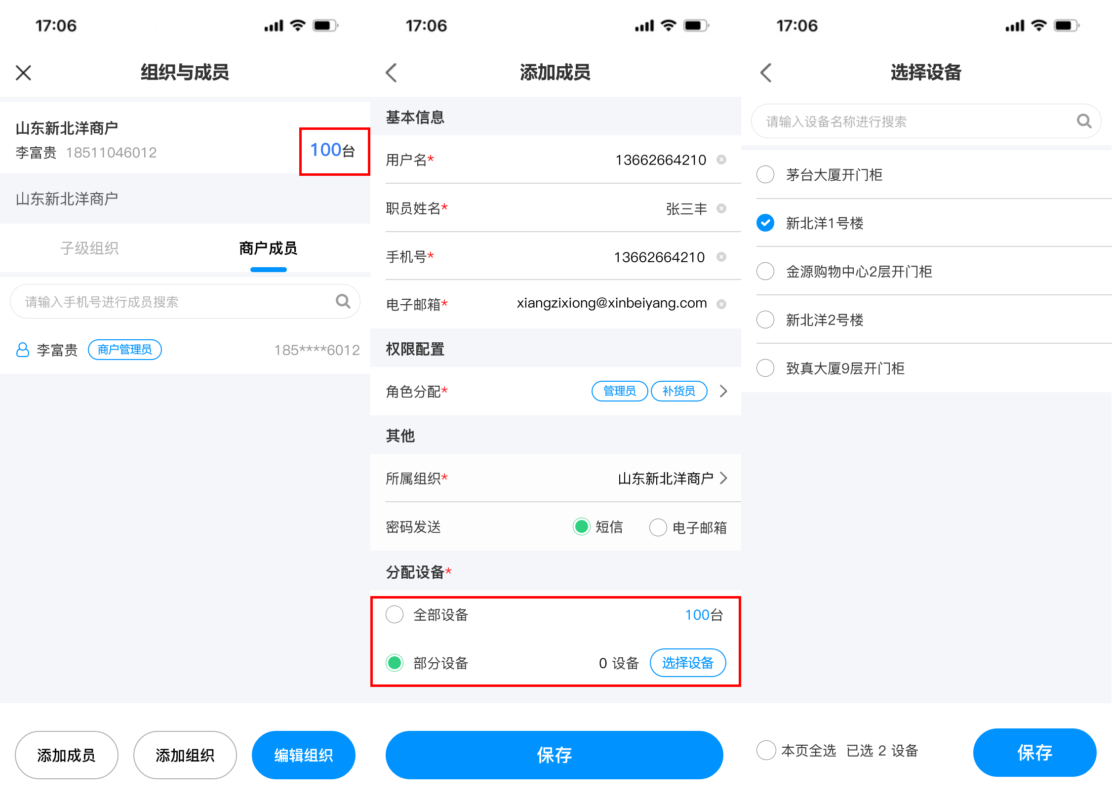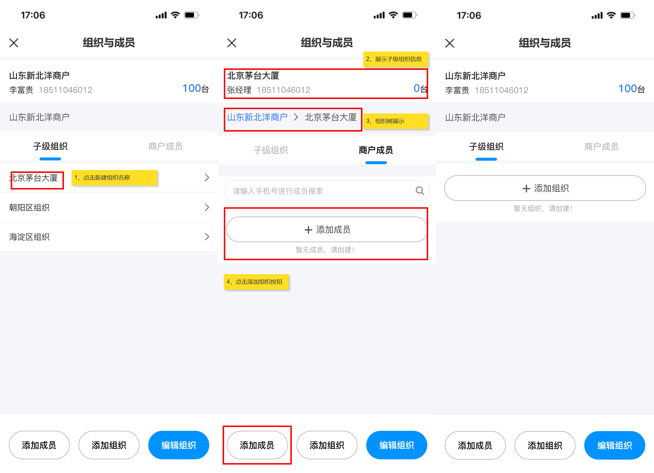 ## 使用场景 当前运营商组织与成员的管理功能仅支持在PC端操作,管理员可在PC端创建多级组织和成员并分配管理权限。然而,随着业务场景的多样化与现场运维需求的增加,现有PC端操作模式暴露出明显的局限性,加盟商,运维人员等角色在现场作业时,常遇到需即时创建组织或添加成员的情况,但受限于PC端固定办公场景,无法及时响应现场变化,影响运维效率与业务灵活性 ## 手册操作指南: ### 一,创建新增组织 1,在移动端首页新增【组织与成员】入口,点击进入后,展示商户初始组织信息和初始组织下的子级组织和成员,点击设备数量可查看初始组织下的所有设备  2,点击【添加组织】按钮,进入新增组织页面,填写所有信息后,点击【提交】,即可“新增组织成功”。组织添加成功后,新创建的组织会在子级组织列表下置顶展示  ### 二,编辑/删除组织 3,点击【编辑组织】可进入编辑组织页面,对当前组织信息进行修改,更换负责人时,可从成员列表中进行选择,信息修改完成后,点击页面底部【保存】按钮即可修改成功 4,如需删除组织,进入编辑组织页面后,点击底部的【删除】按钮,则可删除当前组织,删除组织时,需二次确认,当被删除组织下存在,设备,人员,子级组织时不能被删除,需解除清空组织的下的所有人员,设备,子级组织后方可直接删除成功(初始组织不能被删除)  ### 三,添加新增成员 5,新建组织成功后,在当前子级组织列表展示新创建的组织,点击新建组织名称后,可进入下级组织详情页面,顶部展示新建的组织信息,组织树展示当前组织和上级组织名称,点击上级组织名称可返回上级组织,新建组织下的子级组织和成员列表均为空展示,点击 “商户成员” tab切换至成员列表点击列表或底部的【添加成员】按钮,可跳转至添加成员页面,点击 “添加组织” 按钮可为当前组织继续添加子级组织  6,进入添加成员页面后,需要填写用户名,姓名,手机号和邮箱(用户名 用于运营商平台登录账号),点击【角色分配】可为创建的成员分配角色权限,在那个组织下添加成员,所属组织展示该组织名称,也可选择其他组织。密码发送默认短信发送,也可选择邮箱发送,分配设备时分为两个场景: (1)场景一:当组织设备为0,在创建人员时,只能选择 “全部设备” 即代表负责该组织下的全部设备,如后续为组织分配设备后,该成员即可负责该组织下的全部设备 当所有信息填写完成后,点击【保存】按钮,弹出 “新增成员成功” 提示,并告知密码已按选择方式,短信/邮箱发送。  (2)场景二:当组织设备不为0,在组织下添加成员分配设备时,可选择 “全部设备” 和 “部分设备” 两种选择方式,选择 “部分设备” 后,可点击【选择设备】按钮,在当前组织的设备池中选择需要负责的部分设备数量,选择完成后,点击【保存】按钮即可回到创建成员页面,此时部分设备数量反显已选择的设备数量。如要取消或增加设备数量,即可再次点击 “选择设备” 按钮在设备池中进行选择增加或取消  ### 四,编辑修改成员信息 7,当成员创建成功后,新创建的成员展示在 “商户成员” 列表中并且置顶展示,点击【成员名称或箭头】可进入成员详情页面,可对已经创建人员的基本信息,权限,组织,以及启用/禁用,进行编辑修改,用户名不可进行修改,如需修改人员负责的设备,也需遵从组织 “设备为0” 和 “设备不为0” 的两种场景,为0时,只能选择全部设备,不为0时,可选择全部设备和部分设备,当信息修改完成后,点击保存,即可更新信息成功,成员列表反显展示新修改的信息  ### 五,成员启用/禁用 8,如需禁用成员,则可在成员详情页面,点击启用【开关】对成员进行 “禁用” 操作,启用和禁用时均需二次确认,点击确认后,成员启用状态变更为禁用状态,成员被禁用后,所有权限均不可使用,也不能登录系统(启用/禁用操作实时生效)  9,当成员被禁用后,返回组织与成员页面,被禁用的成员置灰展示,代表该成员已被禁用,如点击被禁用的成员进入详情页面,是不能编辑修改成员信息的,如修改了信息点击【保存】时,会提示:保存失败,请启用成员后,再编辑成员信息  ### 六,成员变更组织 10,如需给已经创建的成员变更组织,则可在成员详情页面,找到 “所属组织” 点击进入更换组织页面,默认展示当前账号权限的最高组织(举例:当前账号为二级组织管理人员,那此时默认展示二级组织)可从高依次向下选择,点击【下级】按钮后,可进入下级组织进行选择,点击组织树的【上级组织名称】即可返回上级组织。找到需要调整的组织名称后,“选中组织” 点击底部【确定】按钮,即可更换成功  11,当组织更换成功后,所属组织显示新选择的组织名称,此时会toast提示:数据正在同步,预计30秒后成功,当数据同步成功后,该成员从原组织的商户成员列表中移除,并出现在新变更组织的商户成员列表中。(当组织变更后,该成员在之前组织下负责的设备会被清除,需在新组织下重新分配)