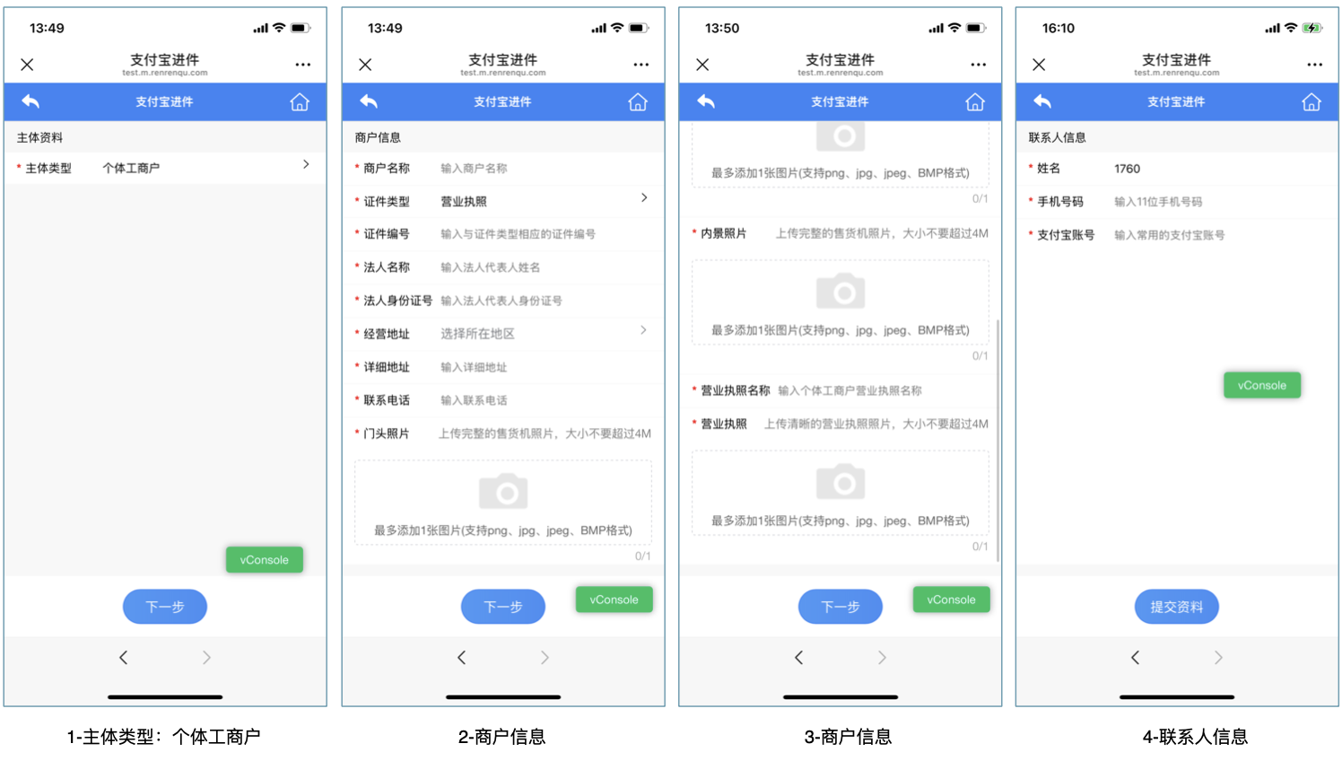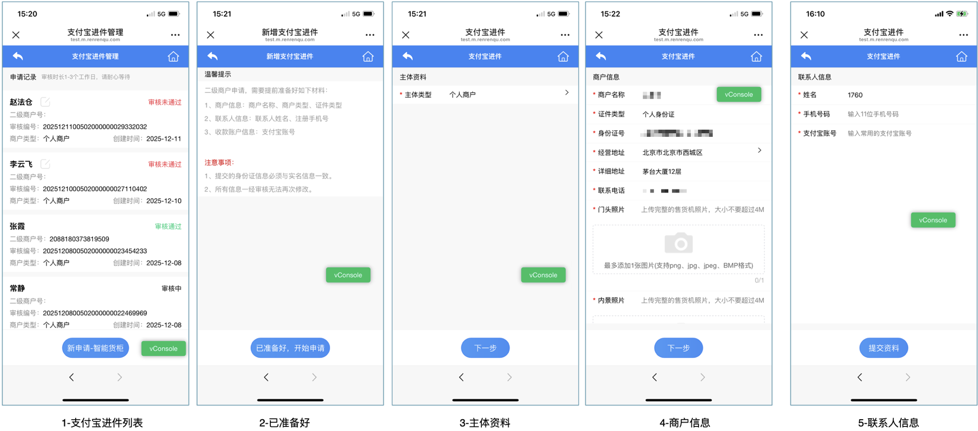 ## 背景 作为新北洋下的客户想要使用“支付宝免密支付”,需要先进件成为新北洋服务商下的二级商户 ## “名词”解释 个体工商户:营业执照上的主体类型一般为个体户、个体工商户、个体经营,主体类型选择“个体工商户” ## 准备材料 谁来进件:进件没有指定具体人员,可经营者自己进件或者其他人进件 准备材料:1、个体工商户营业执照照片;2、经营者身份证号;3、门头照片(可拍摄带店名称的门头照片);4、内景照(可拍摄店内内景照片) > 商户可在移动端进件,也可在运营商完成支付宝进件 ## 一、移动端进件流程 1、登录人人取移动运营首页,进入“收款配置”菜单,点击“支付宝进件” > 注意: 1、若商户同时运营智能货柜与售货机,在 “支付宝进件” 环节仅需填写一套进件信息即可,无需为两类设备分别填写 2、两类设备下的“支付宝进件”是同一套数据  2、进入支付宝进件页面,点击“新申请-智能货柜”,填写进件信息,进件主体选择“个体工商户”  3、填写商户信息:商户名称、证件类型、证件编号、法人名称、法人身份证号、联系电话、经营地址详细地址、上传营业执照照片、上传门头照片和内景照片 > 注意: 1、商户名称:需与收款支付宝账户名称一致; 2、证件类型选择营业执照; 3、证件编号:填写营业执照上的统一社会信用代码编号,统一社会信用代码的长度为18位,务必确保填写完整,不要遗漏; 4、法人名称:填写营业执照上的法定代表人名字; 5、法人身份证号:填写法定代表人的身份证号; 6、联系电话:填写手机号,不要填写座机电话; 7、经营地址与详细地址填写营业执照上的住所地址; 8、营业执照名称填写营业执照上的名称信息; 9、门头照片可拍摄带有店名名称的门头照片; 10、内景照片可拍摄店内内景照片  4、填写联系人信息:姓名、手机号、支付宝账,填写完成后点击“保存”按钮。 > 注意: 1、姓名可填写经营者姓名; 2、手机号填写经营者手机号; 3、支付宝账号,用作结算账号;个体工商户收款支持填写与个体工商户营业执照上的名称同名的企业支付宝账户,也支持填写经营者个人同名的个人支付宝账户,二级商户根据自己选择填写对应的进件的二级商户名称和商户支付宝账号  ## 二、运营商进件步骤 1、登录人人取运营商管理平台PC端,进入“财务管理-支付信息管理-支付宝进件管理”菜单 > 没开通“支付宝进件管理”菜单时,联系平台技术支持或者售后配置 查看链接:https://mrdoc.renrenqu.com/project-1/doc-90/ 注意:直付通进件是支付宝进件的入口,该页面无列表数据,此页面最初仅面向得益商户开放,**给其他商户配置菜单时,请勿开通该功能菜单**。  2、进件时,商户主体类型选择“个体工商户”  4、填写商户信息:商户名称,证件类型、证件编号、法人名称、法人身份证号、经营地址、详细地址、联系电话等,上传营业执照照片、门头照片、内景照片等 > 1、商户名称需与收款支付宝账户名称一致;2、证件类型选择营业执照;3、证件编号填写营业执照上的统一社会信用代码编号,统一社会信用代码的长度为18位,务必确保填写完整,不要遗漏;4、法人名称填写营业执照上的法定代表人名字;5、法人身份证号填写法定代表人的身份证号;6、联系电话填写手机号,不要填写座机电话;7、经营地址与详细地址填写营业执照上的住所地址;8、营业执照名称填写营业执照上的名称信息;9、门头照片可拍摄带有店名名称的门头照片;10、内景照片可拍摄店内内景照片  5、填写联系人信息:姓名、手机号码、支付宝账号,填写完成后点击“保存”按钮。 > 1、姓名可填写经营者姓名;2、手机号填写经营者手机号;3、商户支付宝账号,用作结算账号,要求与进件的二级商户名称同名,且是实名认证支付宝账户(个体工商户收款支持到与个体工商户营业执照上的名称同名的企业支付宝账户,也支持到与经营者个人同名的个人支付宝账户,请二级商户根据自己选择填写对应的进件的二级商户名称和商户支付宝账号)  5、提交完成后,需要去支付宝签约,操作看02 商户去支付宝签约 > 去支付宝签约步骤:https://mrdoc.renrenqu.com/project-20/doc-550/ 6、签约完成后,售后配置好支付宝支付参数后,需要在运营商平台把设备的“支付宝免密支付”和“支付宝H5支付”打开 > 当新北洋告知已经配置好支付宝参数后,运营商需要打开设备的“支付宝免密支付”和“支付宝H5支付”,此时可以进入第7步操作 7、登录运营商管理平台PC端,进入“设备管理-远程配置-选择支付方式”菜单,打开开门柜设备的“支付宝免密支付”和“支付宝H5支付”  8、多选开门柜设备后,点击“批量支付方式”按钮,可批量打开设备的“支付宝免密支付”和“支付宝H5支付”  9、找到“支付宝免密支付”和“支付宝H5支付”,点击“打开”后,点击“保存”按钮  10、也可单台设备打开支付方式,找到设备后,点击操作处的“编辑”按钮  11、打开“支付宝免密支付”和“支付宝H5支付”后,点击保存按钮  12、支付宝支付方式配置完成后,可配置商品后,测试支付方式,查看收款。 具体查看https://mrdoc.renrenqu.com/project-20/doc-549/