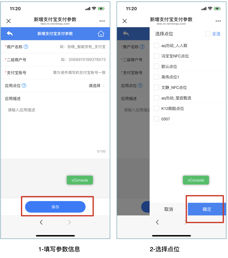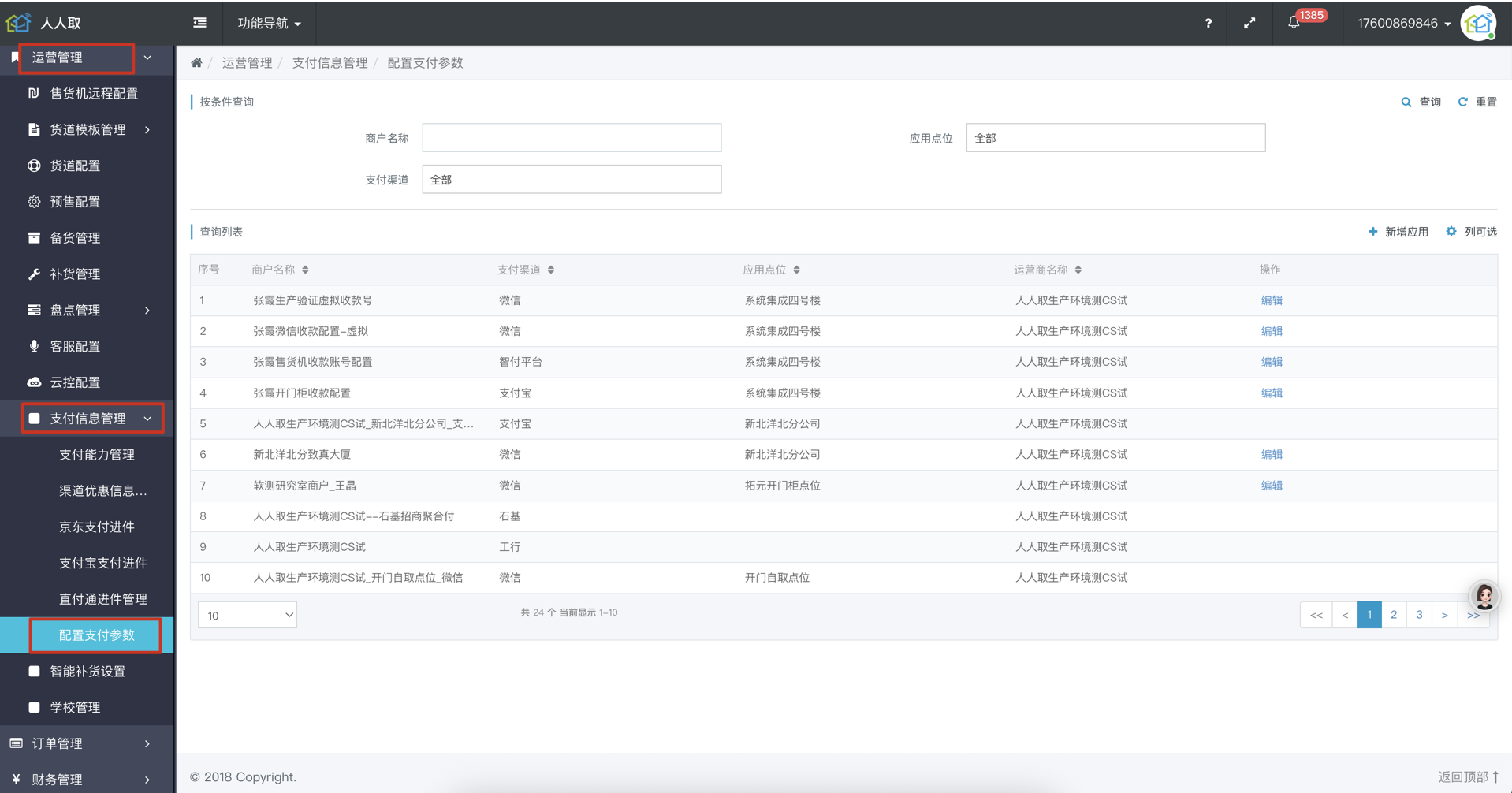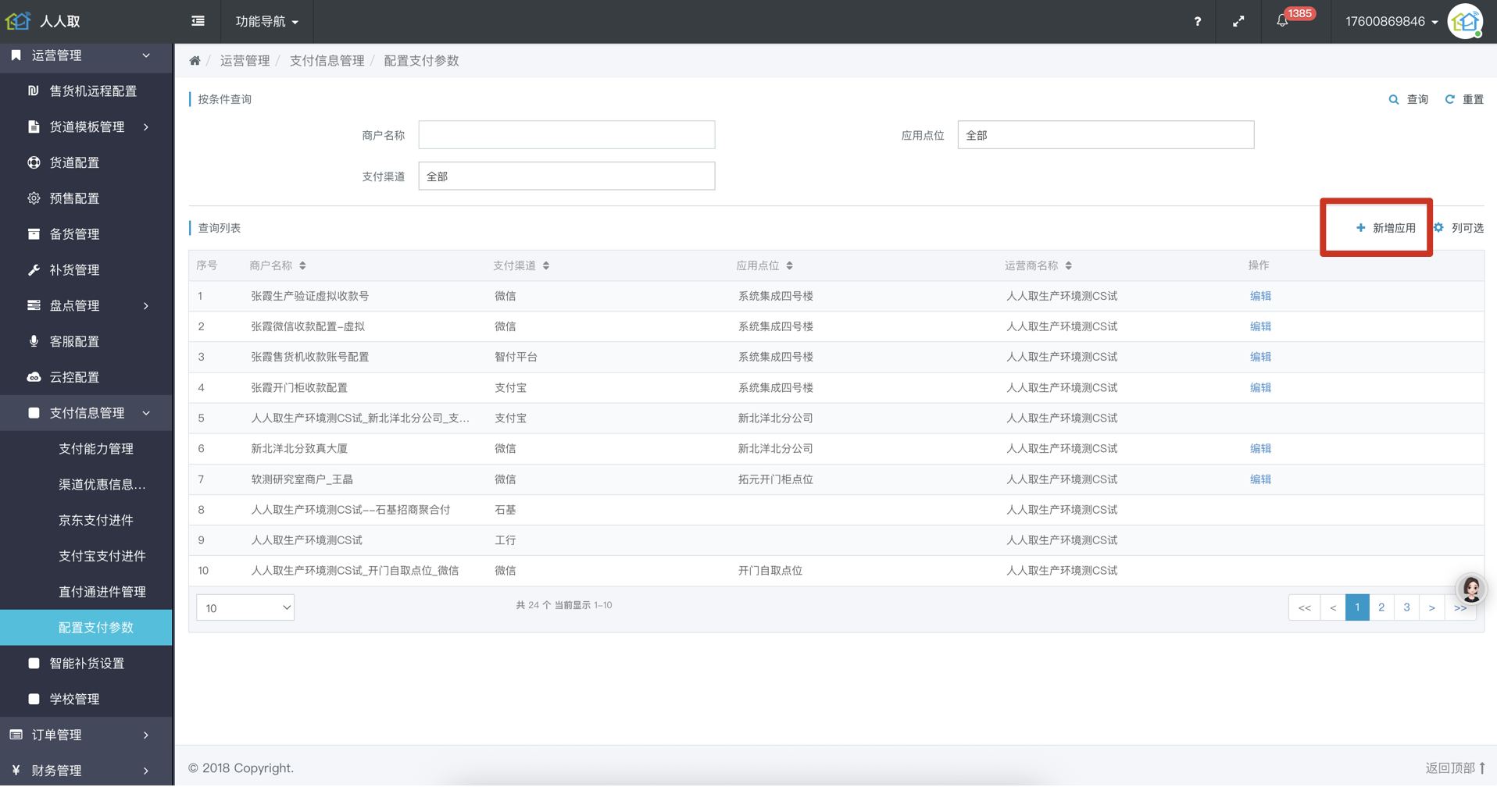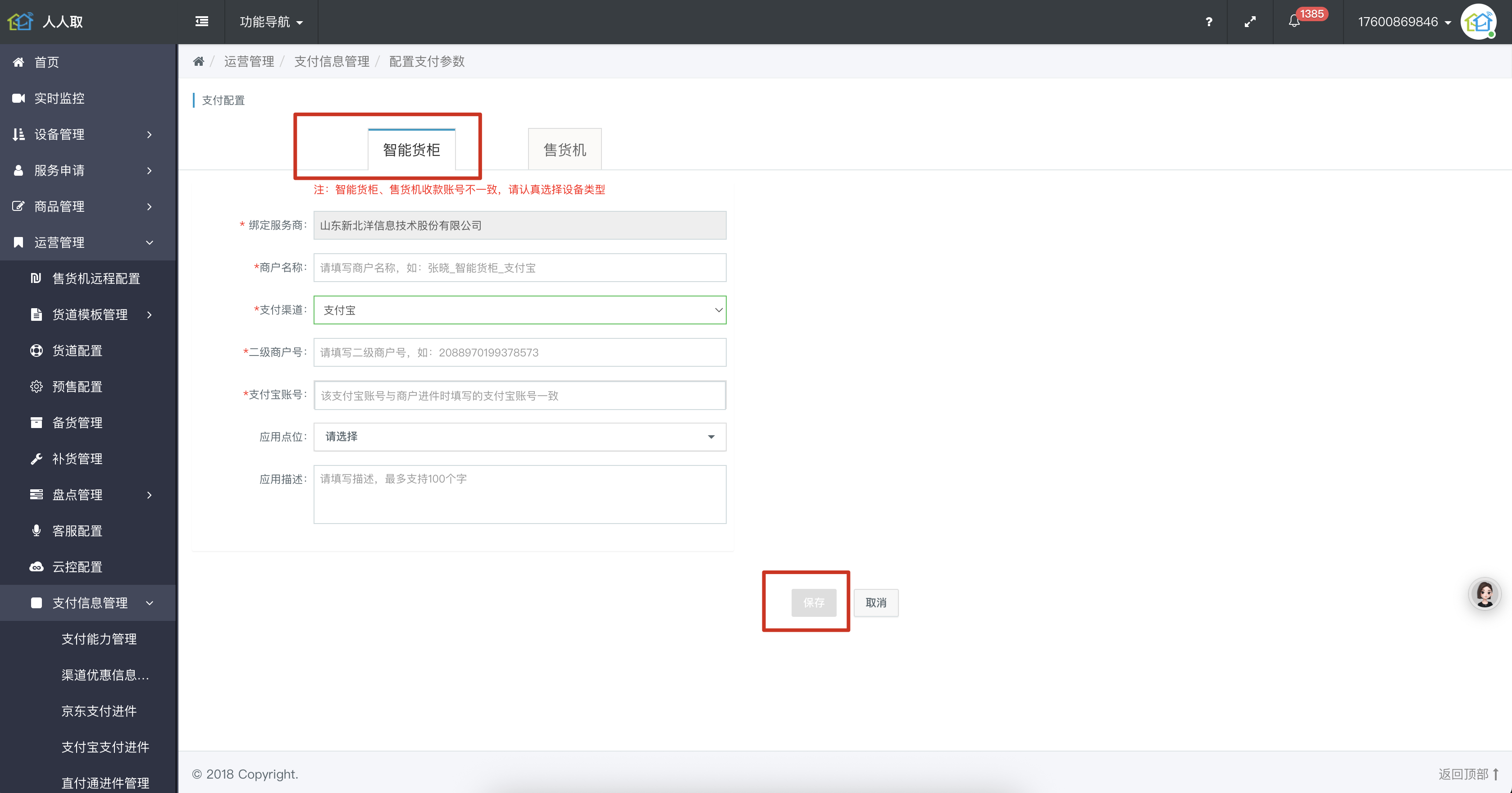 ## 重点注意: > 1、如果开门柜设备挂接了NFC设备,除了配置支付宝免密支付方式和支付宝H5支付方式,还需要再配置一套支付宝NFC支付方式, 配置“支付宝NFC支付”流程:https://mrdoc.renrenqu.com/project-20/doc-608/ 2、支付宝重力柜设备也需要配置这两套支付方式 ## 一、移动端配置支付宝参数 1、登录移动运营端进入首页,找到“其他-收款配置”菜单,找到“智能货柜-支付宝参数配置”页 > 注意: 1、商户只有智能货柜,只配置智能货柜的微信参数配置,商户只有售货机时只需配置售货机的微信参数配置 2、商户同时有智能货柜和售货机时,且智能货柜和售货机支付参数都需配置 3、配置支付参数可在移动端配置,也可在运营商配置  2、点击“支付宝参数配置”进入智能货柜支付宝支付参数列表页面,点击“新增支付宝支付参数” > 注意: 1、有“编辑”按钮的支付参数数据,是商户在运营商平台和移动运营创建的支付参数; 2、无“编辑”按钮的支付参数数据,是售后在BOSS系统为商户创建的支付参数;  3、进入新增页面,填写商户名称、二级商户号、支付宝账号、应用点位、应用描述后,点击“保存”按钮 > 注意: 1、商户名称填写样式:商户名称_设备类型_支付平台,如:北京可诺科技有限公司_智能货柜_支付宝 2、二级商户号:支付宝进件后得到的商户号 3、支付宝账号:进件支付宝时填写的支付宝账号 4、应用点位:该字段不是必填项,其作用是区分不同的收款账号。 a、场景一:单一收款账号 多数商户仅开通一个收款账号,无需选择点位。例如:北京可诺科技有限公司无其他收款账号,在配置支付参数时,无需选择任何点位。 b、场景二:多个收款账号(多分销商) 奶企等存在多分销商的商户,需通过点位区分不同分销商对应的收款账号,此时配置支付参数时必须选择对应点位。例如:兰州庄园商户的分销商张某名下有 A点位,配置支付参数时,应用点位需选择 A 点位(有多个点位时,多个点位都需选择)。  ## 二、运营商配置支付宝参数 1、登录运营商系统,找到“运营管理-支付信息管理-配置支付参数”菜单,进入配置支付参数列表页面  2、在配置支付参数列表页面,点击“新增应用”按钮  3、选择“智能货柜”,支付渠道选择“支付宝”填写商户名称、二级商户号、支付宝账号、应用点位、应用描述等信息后,点击“保存”按钮 > 注意: 1、商户名称填写样式:商户名称_设备类型_支付平台,如:北京可诺科技有限公司_智能货柜_支付宝 2、二级商户号:支付宝进件后得到的商户编号 3、支付宝账号:进件支付宝时填写的支付宝账号 4、应用点位:该字段不是必填项,其作用是区分不同的收款账号。 a、场景一:单一收款账号 多数商户仅开通一个收款账号,无需选择点位。例如:北京可诺科技有限公司无其他收款账号,在配置支付参数时,无需选择任何点位。 b、场景二:多个收款账号(多分销商) 奶企等存在多分销商的商户,需通过点位区分不同分销商对应的收款账号,此时配置支付参数时必须选择对应点位。例如:兰州庄园商户的分销商张某名下有 A点位,配置支付参数时,需选择 A 点位(有多个点位时,多个点位都需选择)。  ## 三、BOSS系统配置支付宝参数 1、售后登录BOSS系统,找到“商户服务开通-支付开通-商户支付应用管理”菜单 网址:http://unicorn.boss.takeware.cn/#/app/payApply/list  2、在“商户支付应用管理”列表页面,点击右侧的“➕新增应用”按钮  3、填写应用配置信息,填写商户信息、点位信息、所属网关、应用名称、支付能力 > 1、所属网关选择支付宝;支付能力选择“支付宝免密支付”和“支付宝H5支付”  4、填写支付宝支付参数,填写完成后点击“保存”按钮 > 1、参数里默认的支付数据如下: a、密钥生成方式:UTF-8 b、签名算法类型:RSA2 c、合作伙伴身份(PID):2088431807008245 d、支付宝公钥:重要的信息,不在这里写,去boss系统看这个值 e、应用私钥:重要的信息,不在这里写,去boss系统看这个值 f、appId:2021001158626086 g、结算账户类型:loginName h、支付回调地址:http://payback.renrenqu.com/pay/aliNotify i、版本:v1.0 g、芝麻信用服务号:2024041100000000000096092400 k、外部类目Id:credit_risk_vending_machine_0001   5、配置完成后,在“商户支付应用管理”可看到新增的商户支付宝配置信息  6、进入“商户服务开通-支付开通-商户支付能力管理”打开支付方式,  7、搜索找到商户名称后,点击操作处的编辑  8、把“支付宝免密支付”和“支付宝H5支付”打开,点击“保存”按钮 > 打开支付方式后,告知商户去运营商平台把设备的“支付宝免密支付”和“支付宝H5支付”打开  9、新北洋配置完成后,告知运营商,运营商需要把设备的支付能力打开 具体链接:https://mrdoc.renrenqu.com/project-20/doc-549/