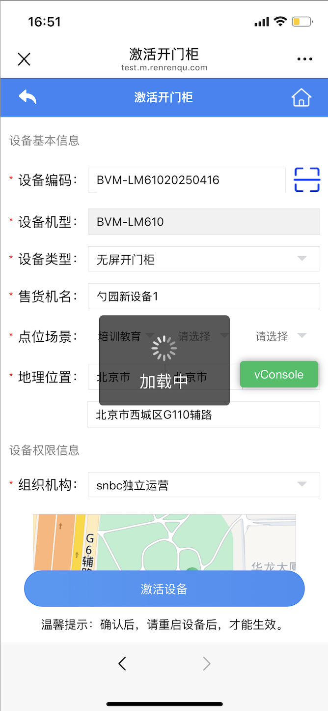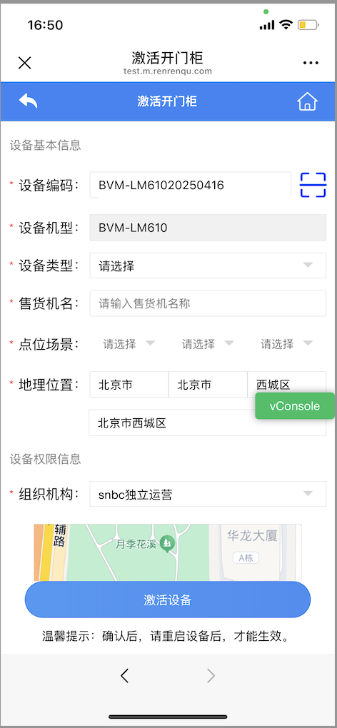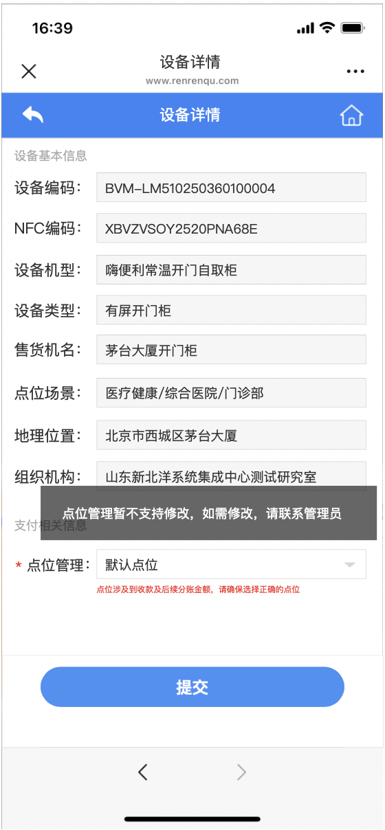 ## 其他开门柜设备类型 其他开门柜设备类型,主要是:云从设备、托元算法设备、开门柜设备外挂npad屏(碰一碰支付) > 重点注意:如果是“开门柜设备外挂NPAD屏(碰一碰支付),需要先配置好商户的“支付宝NFC支付”能力 ## 激活设备步骤 1、微信搜索“人人取运营”并关注公众号,手机号登录进入公众号首页,点击“智能开门柜-设备激活”菜单 > 没有“设备激活”菜单时,联系新北洋对接人员配置菜单 查看链接:https://mrdoc.renrenqu.com/project-1/doc-90/ > 非萤启的独立运营商户在开通相关权限时,提前2-3天注册人人取账号,让新北洋对接人员发邮件至sundalin@newbeiyang.com、liuzilu@newbeiyang.com和wangxirong@newbeiyang.com。邮件内容:XX商户申请配置“人人取”开门柜权限和开门柜小程序权限。    2、填写激活开门柜设备信息,设备编码、设备类型、点位名称、点位场景、地理位置 > 设备编码:扫描设备上的条形码;设备机型:默认匹配,不需要填写;设备类型:选择设备是有屏还是无屏幕;售货机名称:即开门柜设备的名称;点位场景:手动选择符合设备所在地;地理位置:信息默认加载设备所在地位置,也可手动选择;组织机构:一般有默认的组织机构,也可以手动修改。 当提示设备未维护时,在微信开门柜问题总群里找技术支持反馈问题  3、信息填写完成后,点击“提交设备”按钮,激活设备,激活设备之后,重启设备。  4、激活设备之后,商户可以在移动加盟中心“激活审核”列表,完善已经激活的设备的信息,选择点位数据。 >注意:“开门柜外挂npad屏”设备,已经配置完NFC支付时,点位暂不支持修改。需要修改时,找研发同事支持  5、完善已激活设备信息时,如果“支付宝重力柜设备”和“开门柜外挂npad屏”开门柜设备,已经配置了支付宝NFC支付时,售货机性质和点位管理数据暂不支持修改,其他类型开门柜设备信息可以修改。 >注意:在服务商pc端和运营商pc端,已激活的设备,如果是“支付宝重力柜设备”和“开门柜外挂npad屏”开门柜设备,相关的售货机性质和点位管理数据暂不支持线上修改,如需修改,请找研发工程师支持    6、修改完成后,点击“提交”按钮,信息修改完成  7、设备激活后,可进行02步创建角色与组织机构并给用户分配售货机权限 创建角色与用户配置权限:https://mrdoc.renrenqu.com/project-20/doc-555/