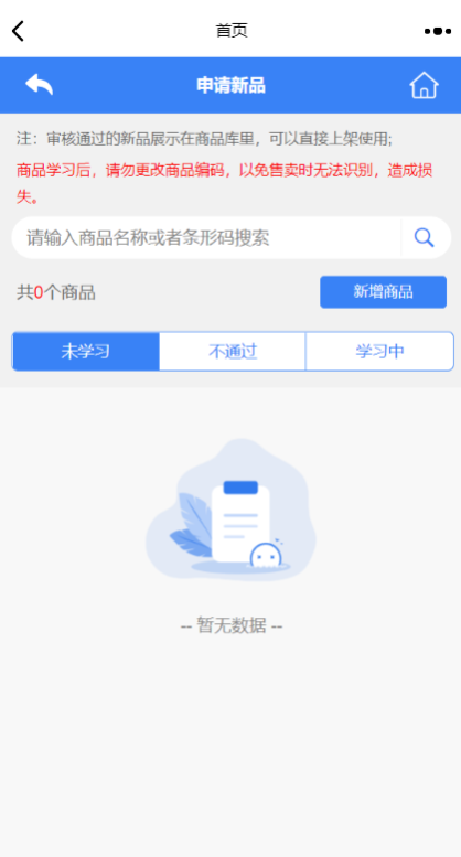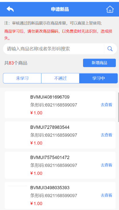 ## 申请新品 当商品库的商品无法满足您的运营要求时,您可“新品申请”新增商品,审核通过后可在开门柜上进行售卖使用 ## 申请新品流程 ### 一、申请新品流程 1、微信搜索“人人取运营”并关注公众号,点击“运营中心”—“运营总览”手机号登录进入公众号首页,点击“申请新品”菜单   2、进入申请新品页面,查看租户商品状态,通过点击去学习,学习商品,或点击“新增新品”按钮    3、根据提示,选择是标品还是非标品学习,填写商品基本信息,填写商品名称、商品条码、商品编码信息,选择商品品牌、商品类型、选择商品分类,填写商品价格等信息 > 注意:商品名称命名为:品牌+名称(或口味)+规格;商品条码:商品有条形码时输入条形码,无条形码时,任意输入数字;商品编码:任意输入数字即可;零售价是显示在商品库处的商品价格。   4、基本信息填写完成后,上传商品的图片信息,包括:商品正面图、商品反面图、商品顶部图、商品底部图、商品左侧图、商品右侧图片共6张图片,图片上传完成后,点击“提交申请”按钮 > 注意:商品第一张正面图是主图,用于各功能页面的商品展示 图片是不大于5M的jpg或者png图片   5、提交完成后,在申请新品列表页面能看到该商品,且是“待审核”状态,点击可查看商品的详情信息 > 注意:工作日审核周期是1-3天左右,非工作日审核周期是2-5天左右,请耐心等待   6、审核失败的商品,新品申请列表处,商品显示审核失败,点击进入详情,查看具体失败的原因,根据失败的原因修改后再提交申请   7、审核成功的商品直接展示在商品库,可直接使用  ### 二、申请新品通知流程 1、申请新品后,申请人人人取运营公众号会收到审核结果的通知信息 2、审核成功,可点击详情页面查看商品信息   3、审核失败,公众号会收到审核失败通知,点击进入详情页面可根据失败原因修改后,并重新提交