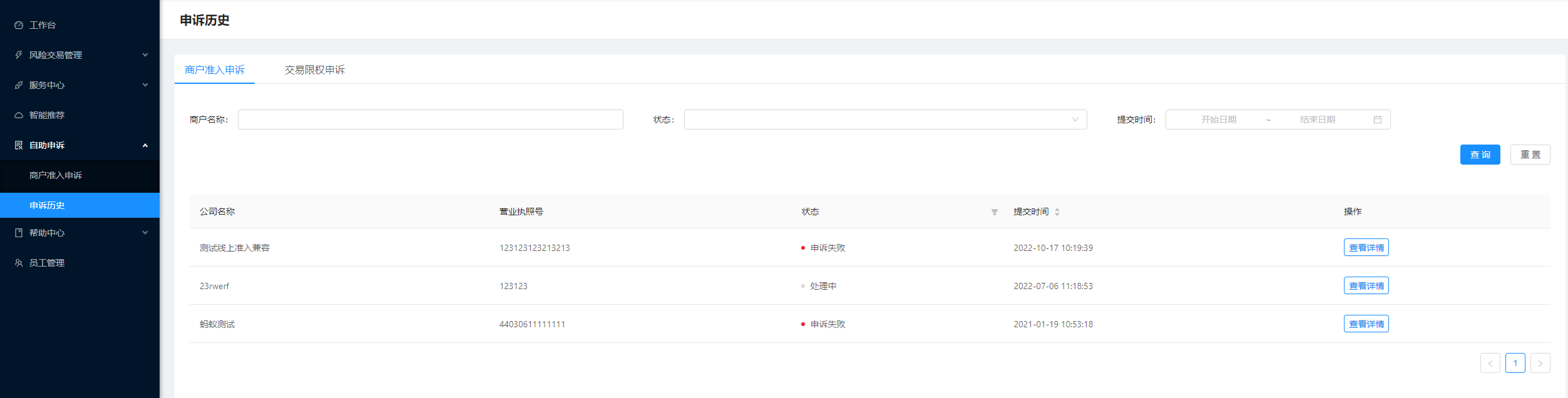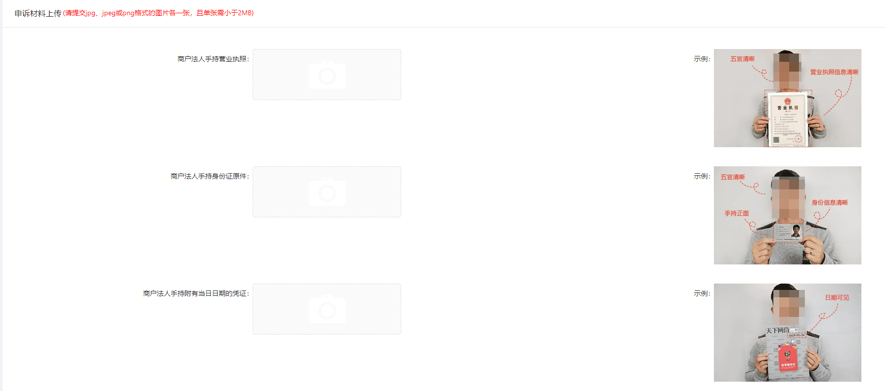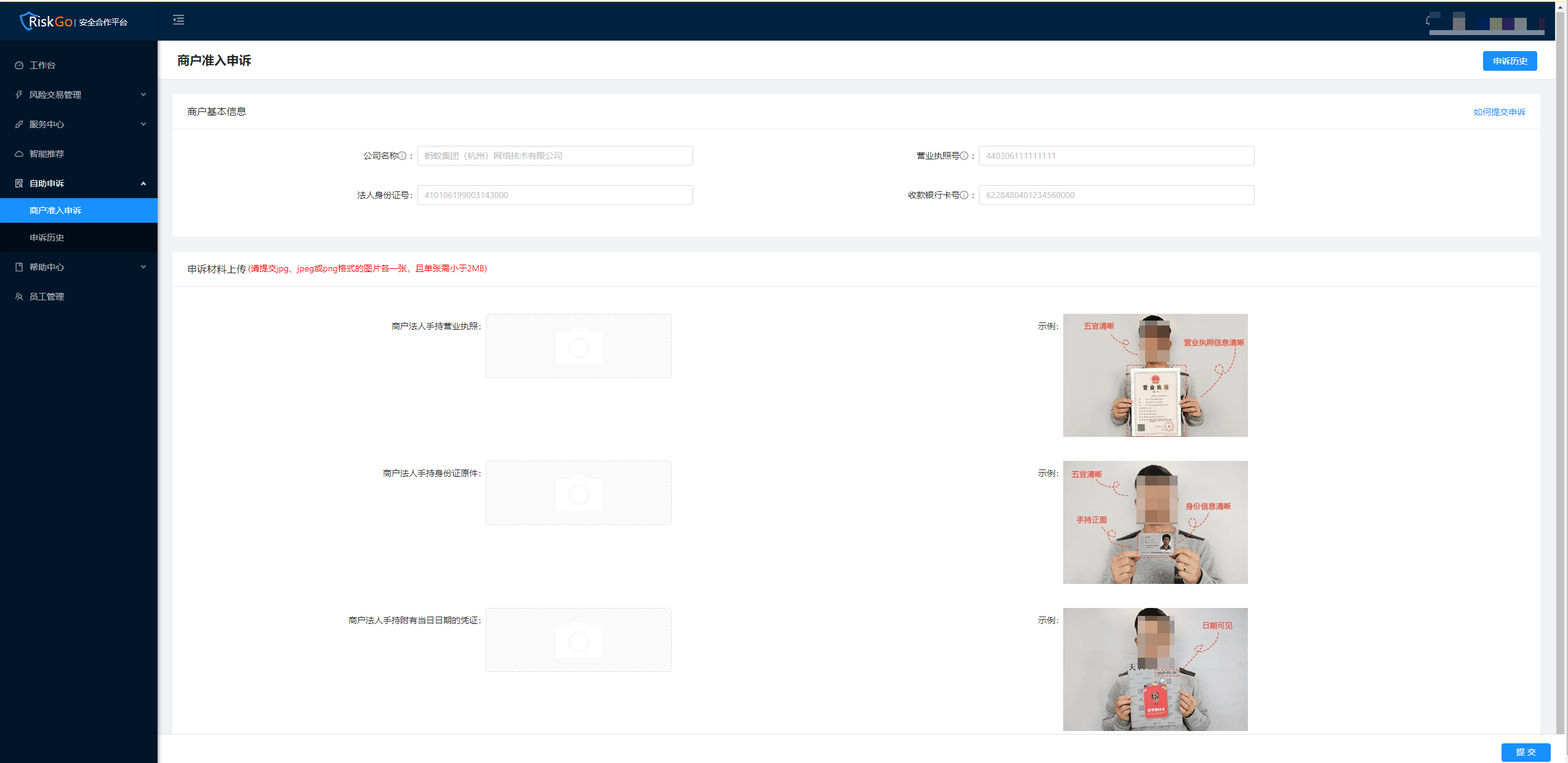 二级商户提示有风险时,可参考该手册解决风险,主要看第二点(二、直付通二级商户准入驳回申诉指引) # 一、直付通二级商户准入驳回类型 ## 1 风险类 #### (1)高风险二级商户: ○ 风险对象:a.历史涉诉且被风险定性的二级商户、风险浓度极高的二级商户;b.通过介质关联的高风险团伙。 ○ 驳回文案:经系统监测,当前进件商户存在风险。 #### (2)高风险平台商: ○ 风险对象:风险浓度极高的平台商、因其下属的二级商户整改无效或发生团伙型违规风险收单,导致暂停或停止进件。 ○ 驳回文案:经系统监测,当前平台商存在风险违规,暂停进件。 #### 解决方案: ○ 高风险二级商户:可以让平台商登录B站/P站/Riskgo平台帮助客户提交资料申诉,高风险商户申诉不保证通过。 ○ 高风险平台商:可以联系对接的BD同学进行风险整改,整改成功后,可联系BD重新发起准入申请。(如果您的平台商暂时无BD跟进,可以打95188,由客服人员指定专人跟进) ## 2 政策类 #### (1)进件账户数超出次数限制: ○ 限定对象:同平台商下同证件限定最多进件6个二级商户账号。 ○ 驳回文案:经系统监测,当前商户在该平台商下进件次数已超限,暂时无法创建。 #### (2)特殊收单产品限定准入: ○ 限定对象:针对部分特殊类收单产品,存在特殊商户准入门槛,商户需符合门槛方可入驻。 ○ 驳回文案:经系统监测,当前进件商户账号类型与申请产品不符,暂时无法创建。 #### 解决方案: ● 进件账户数超出次数限制:为避免同证照批量聚集注册,同证件账户在同一个平台商下最多有6个二级收款账户,超限不予申诉。若存在特殊经营场景和业务需求,可由平台商报备业务BD或客服专员进行特殊申请。 ● 特殊收单产品限定准入:门槛限制,不予准入,若存在特殊业务诉求需求,可由平台商报备业务BD进行特殊申请。 ## 二、直付通二级商户准入驳回申诉指引 若直付通平台商收到其下二级商户的准入驳回通知,经核查后对驳回结果存在异议,可以通RISKGO平台来进行申诉。 #### RISKGO产品 网址链接:https://riskgo.alipay.com/merchantportal/workbench.htm#/appeal/access-appeal 操作路径:RISKGO官网登录-工作台-自助申诉-准入申诉  ## 三、直付通二级商户准入驳回申诉资料介绍 #### 1 商户基本信息 ##### RiskGo展示信息  注:商户名称,营业执照号,法人身份证号,结算账户/收款银行卡均为必填项。且商户准入申诉提交资料需与进件信息保持一致。 ● 商户名称:商户名称字段需与营业执照上保持一致,如小微商户(个人)无营业执照,则填写与身份证一致的经营者姓名。 ● 营业执照号:即营业执照上的编号,如小微商户(个人)无营业执照,可用其他从业资质证明或者经营者的身份证号替代。 ● 法人身份证号:即商户法人(小微商户为其本人)的18位身份证号码。 ● 结算账户/收款银行卡:根据商户选择的结算方式进行填写,结算账户填写二级商户的支付宝结算账号,收款银行卡填写二级商户的同名银行卡号。 #### 2 证照及凭证信息 ##### RiskGo展示信息  注:证照及凭证照片请提交jpg、jpeg或png格式的图片,单张需小于5MB,法人手持营业执照,法人手持身份证,法人手持当日日期证明均为必填项。 ● 法人手持营业执照:需法人本人手持营业执照原件拍摄,无PS,营业执照上信息清晰、真实、完整,营业执照经营内容与门店实际经营内容一致。如小微商户(个人)无营业执照,可用法人手持证件照替代填写。 ● 法人手持证件照:需法人本人手持身份证正面,要求身份证上信息清晰、真实、完整;且姓名与营业执照法人保持一致。 ● 法人手持当日日期凭证:需法人本人手持,当日日期凭证包含多种,如当日报纸,手机日期展示,当日发票,当日纸张等。 ● 经营模式说明:需详细说明商户真实经营模式,并且加盖公章。如小微商户(个人),则公章可用手印替代。 ## 四、直付通二级商户准入申诉结果查询及操作 商户基本信息和证照凭证信息填写完整后,点击下方提交,显示提交成功后,即可等待申诉审核结果。 申诉结果请前往“申诉历史”或已登记邮箱中查询处理结果。 ##### RISKGO产品 网址链接:https://riskgo.alipay.com/merchantportal/workbench.htm#/appeal/appeal-history 操作路径:RISKGO官网登录-工作台-自助申诉-申诉历史-商户准入申诉  ## 五、直付通二级商户准入申诉其他规则 (1)审核时效:审核一般会在1个工作日内处理给出申诉结果。 (2)申诉成功后再次进件时点:申诉成功后,请务必间隔3H再进行重新进件操作。 (3)申诉有效期:申诉成功后,商户申诉有效期为7天,商户需在7天内完成重新进件操作,再次进件需填写与申诉提交一致的信息(法人身份证号,营业执照号,银行卡结算号),避免被二次拦截。